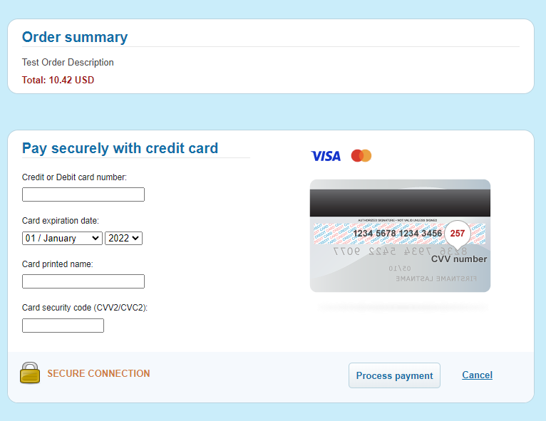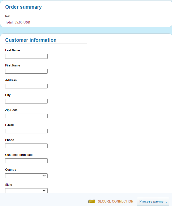 Buy Now Button integration is relevant for Connecting Party who has limited portfolio of products to sell. It is the easiest way to integrate with Payer-Gateway. This way of integration doesn’t require much technical effort. Buy Now Button integration also allows Connecting Party to exclude itself from storing, processing, or transmitting Payer’s cardholder data or other sensitive payment details. Such data is submitted by Payer on Payer-Gateway hosted customer details form and payment form in PCI DSS certified environment.