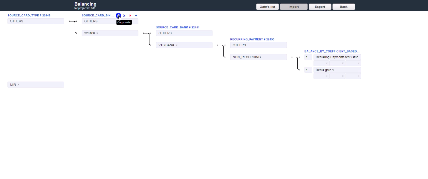 The routing & balancing system allows to distribute traffic between payment gates flexibly depending on the defined criteria and customer’s transaction data. Traffic can be routed to a specific group of gates/processors and distributed between them in accordance with the specified balancing. The balancing is configured on the system Project level in the Routing & Balancing tab.