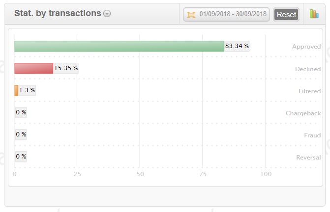 The graph shows the proportions between successful, declined and filtered transactions for a selected period of time.